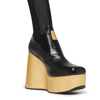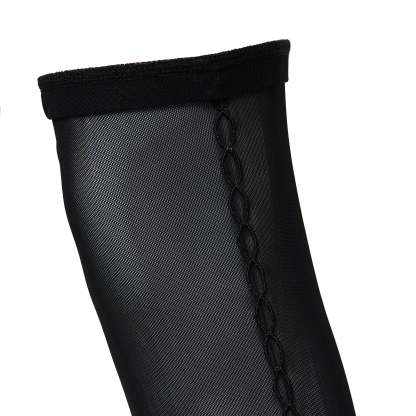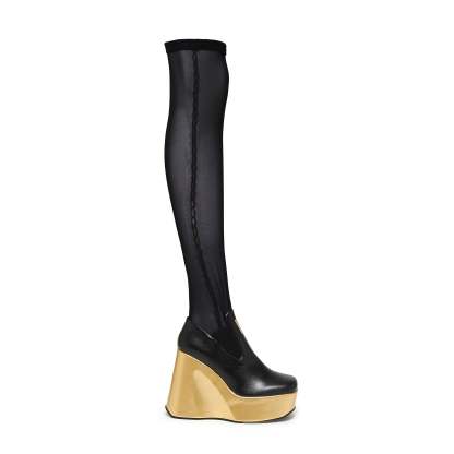 Inspired by icon Megurine Luka, this style was one of our more tougher challenges. We chose a sculptural platform wedge to elevate the look, literally and visually, letting the gold accents catch the light just right. The upper is made from a strengthened fishnet, chosen for both aesthetic and strength (though like any mesh, enough pressure can tear it). A hidden silicone strip inside the thigh band helps grip the leg and keep the boots standing tall all day.